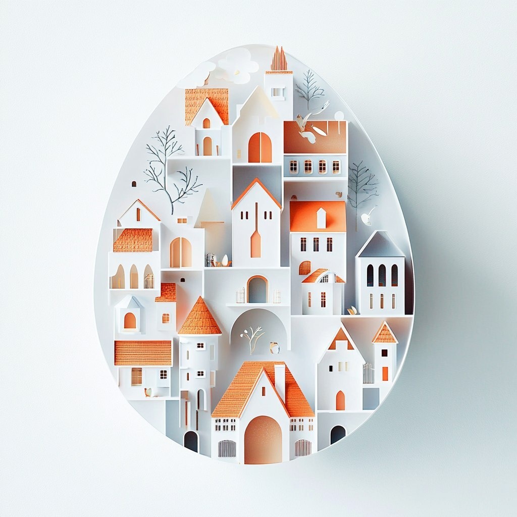Создано на основе запроса: Modern and artistic Easter card. A perfect arrangement of miniature modern houses and intricate architectural elements forming the shape of a Easter egg. Clean lines, minimalist and contemporary design styles, high details, pastel accents. Transparent background, white negative space around the egg, elegant and professional look --- Автоперевод: Современная и художественная пасхальная карта. Круто выглядит? 🤔 https://dzen.ru/id/65c0c65c86e4f837c27b24d7 #ИИ #AI #нейросеть #midjourney #art