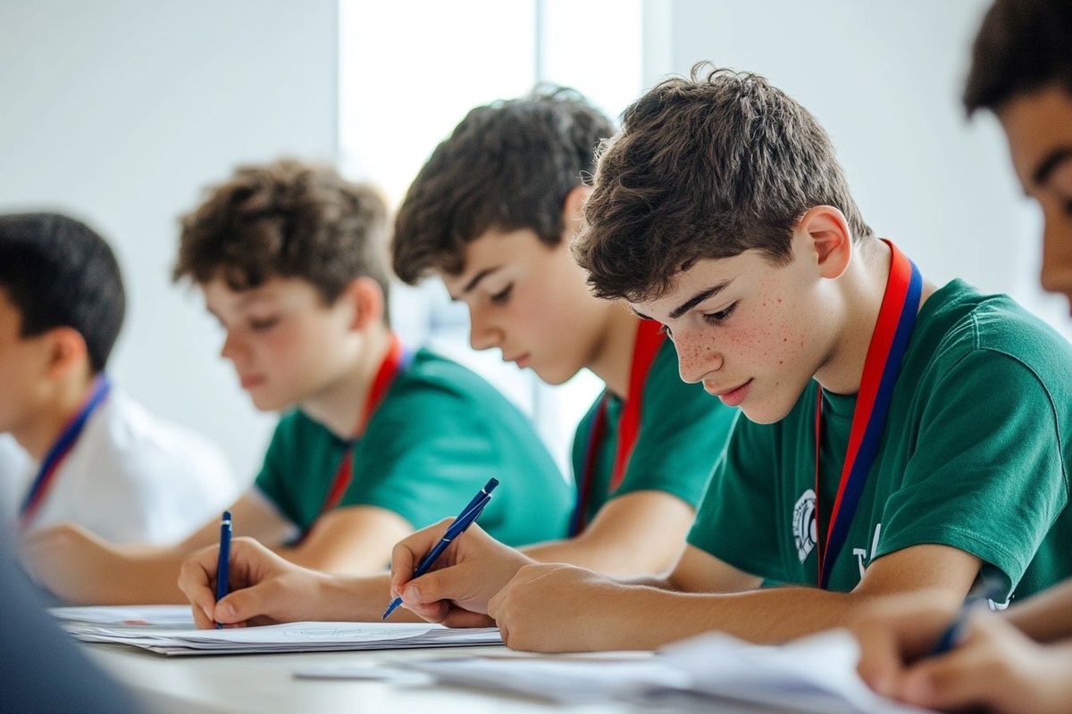 Создано на основе запроса: A photograph of young men writing in a bright, white room at school. They have red and blue lanyards around their necks. The background is white, and they are wearing shirts with green accents. Some of the boys are sitting at tables, writing on paper or working together. --- Автоперевод: Фотография молодых людей, пишущих в яркой белой комнате в школе. Классно выглядит? 🤔 https://dzen.ru/id/65c0c65c86e4f837c27b24d7 #ИИ #AI #нейросеть #midjourney #art