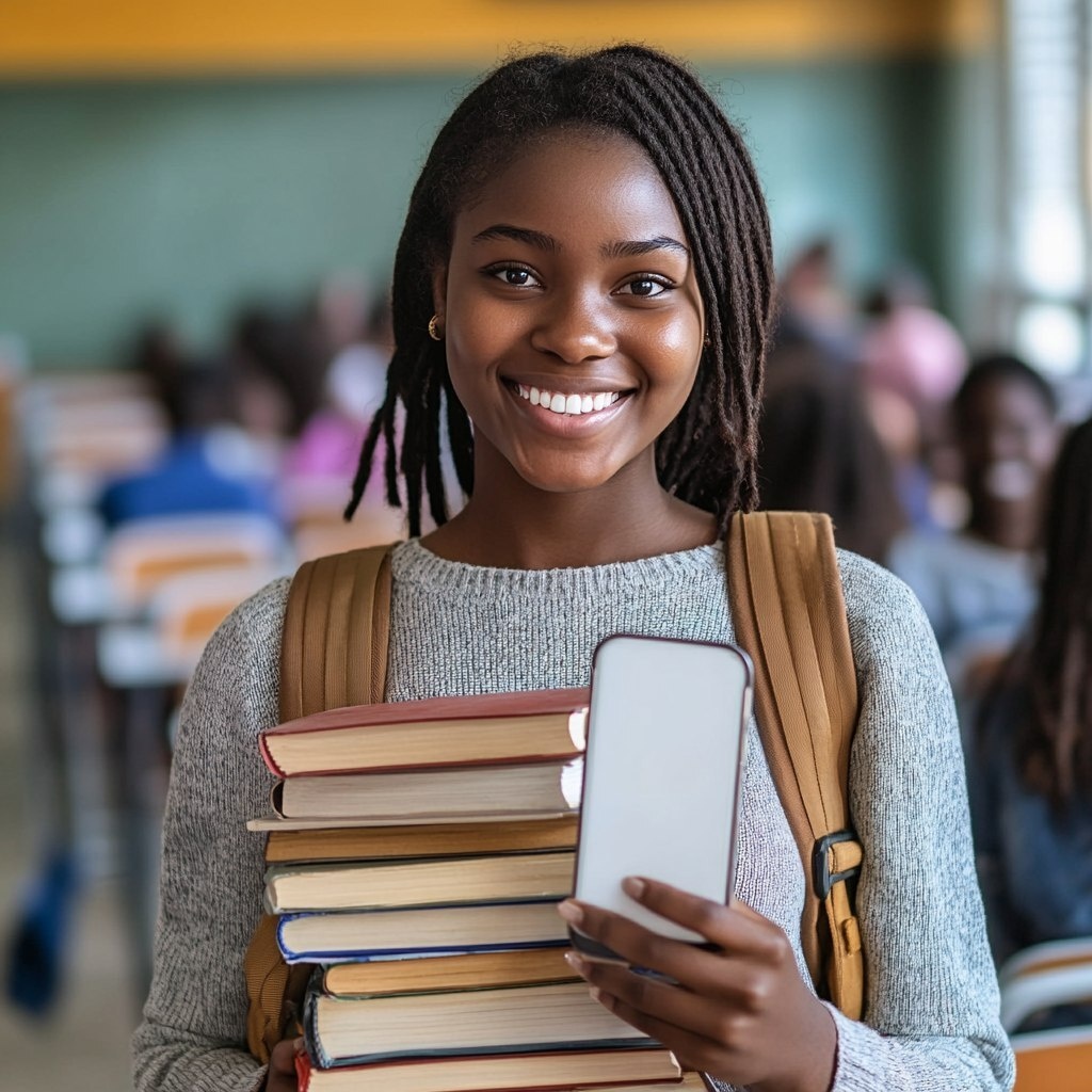 Создано на основе запроса: an african female student carrying a stack of books while showing her white phone screen smiling standing in