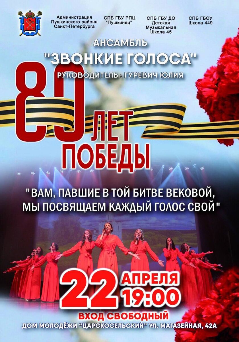 Для жителей Пушкинского района 22 апреля в 19:00 в Доме молодежи «Царскосельский» состоится концерт «Вам, павшие в той битве вековой, мы посвящаем каждый голос свой». Мероприятие посвящено 80-летию Победы в Великой Отечественной войне. Программа представлена специальной подборкой музыкальных произведений, передающих величие и сплочённость нашего народа в военные годы. Вход свободный! #нашпушкинскийрайон #культурный_пушкинский