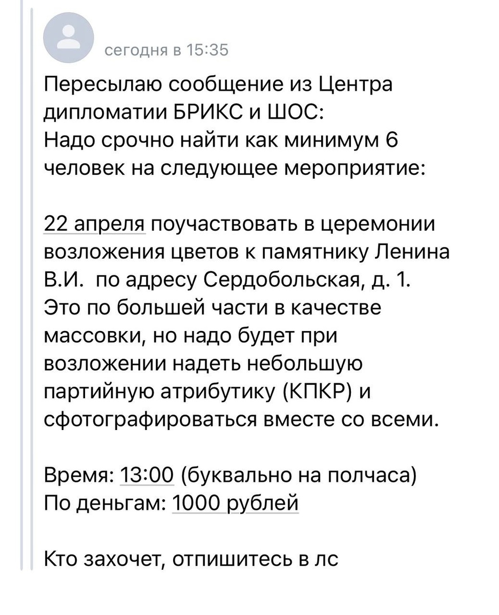 До нас дошли сведения о том, что так называемая партия «Коммунисты России», являющаяся партией-спойлером КПРФ (созданной властями для оттягивания голосов на выборах и дискредитации левых идей), собирается организовать очередную провокацию 22 апреля – в день рождения Владимира Ильича Ленина. Для этого лже-коммунисты набирают массовку среди студентов, предлагая им за участие в мероприятии и фото в их атрибутике 1000 рублей. Уже это само по себе является дискредитацией социалистических идей. Ко всему прочему, мы не знаем, что планируют заставить делать студентов. Вполне возможно, что КПКР хочет в очередной раз поглумиться над советскими ценностями, превратив празднование дня рождения В.И. Ленина в клоунаду. Это излюбленный прием немногочисленной группы лиц, по недоразумению называющих себя «партией». При этом мы не можем не обратить внимание на то, что распространение подобной информации в вузовских чатах в подавляющем большинстве случаев является санкционированным действом. Неужели в гос