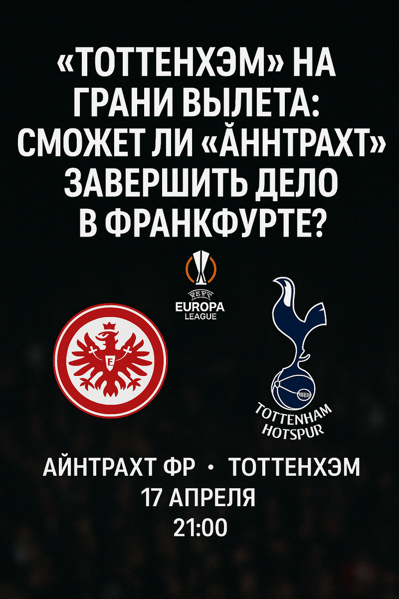 Больше прогнозов тут Я редко делюсь закулисной информацией, но в преддверии ответного матча четвертьфинала Лиги Европы между «Айнтрахтом» и «Тоттенхэмом» не могу молчать. В кулуарах ходят слухи, что Дино Топмёллер готовит тактическую «засушку», а Анге Постекоглу — отчаянный штурм. Этот матч может стать самым драматичным в весеннем этапе Лиги Европы. Ориентировочный состав: Кауã Сантос – Артур Теате, Робин Кох, Тута – Рамус Кристенсен, Эльес Скири, Хьюго Ларссон, Натан Браун – Марио Гётце, Жан-Бахойя – Хьюго Экитике Потери: Ориентировочный состав: Гульельмо Викарио – Педро Порро, Кристиан Ромеро, Микки ван де Вен, Дестини Удоджи – Родриго Бентанкур, Лукас Бергвалл – Бреннан Джонсон, Джеймс Мэддисон, Сон Хын Мин – Доминик Соланке Потери: Команда демонстрирует стабильную форму и уверенно играет на своем поле. Команда испытывает трудности на выезде и нуждается в победе для выхода в полуфинал. История противостояний говорит о преимуществе «Айнтрахта». Больше прогнозов тут Обе команды