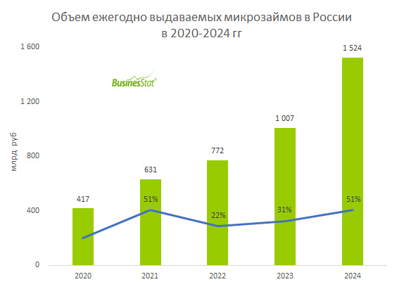 По данным «Анализа рынка микрозаймов (микрофинансов) в России», подготовленного BusinesStat в 2025 г, в 2020-2024 гг объем ежегодно выдаваемых микрозаймов в стране увеличился почти в 4 раза: с 417 до 1 524 млрд руб. В 2022 г экономическая нестабильность привела к снижению реальных располагаемых доходов населения и увеличению числа людей, нуждающихся в краткосрочном финансировании для решения неотложных проблем. Ужесточение требований к выдаче кредитов банками сделало займы в микрофинансовых организациях более доступными для заемщиков с плохой кредитной историей или отсутствием официального трудоустройства. В свою очередь, на фоне финансового кризиса выплачивать долги россиянам стало труднее. С 1 апреля 2022 г Правительство РФ ввело мораторий на банкротство сроком на 6 месяцев. Подобная мера, призванная поддержать граждан и предприятия в условиях экономической неопределенности, смягчила последствия задержки платежей, снижая необходимость оформления новых займов. Мораторий стимулировал н