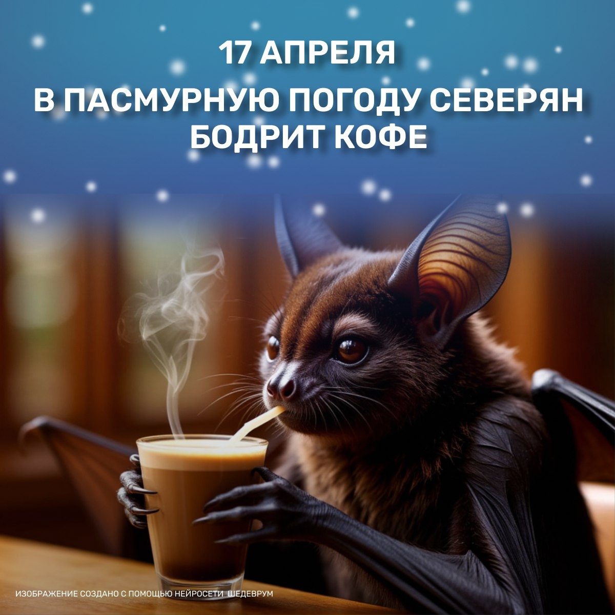 🌤В Мурманской области 17 апреля, в День кофе и День летучих мышей, ожидается облачная с прояснениями погода. Ночью местами мокрый снег, днем дождь. Ветер восточный, юго-восточный умеренный. Температура воздуха ночью от +1 до -4 градусов Цельсия, днем +3… +8. Гололедица. ☕️17 апреля в мире отмечают День кофе, а в Италии — День эспрессо. Кстати, кофеин — это особое вещество, которое вырабатывают кофейные деревья, чтобы отпугнуть вредителей и привлечь опылителей. Интересный факт: веб-камеру изобрели для наблюдения за кофе… Просто исследователям Кембриджского университета надоело постоянно ходить в холл, где находилась кофеварка, чтобы посмотреть, есть ли в ней напиток. 🦇Другой праздник — День летучих мышей. А вы знаете, почему эти крылатые предпочитают спать вверх ногами? Дело в том, что им крайне тяжело взлетать с земли, а вот броситься вниз с высоты и полететь — проще простого!