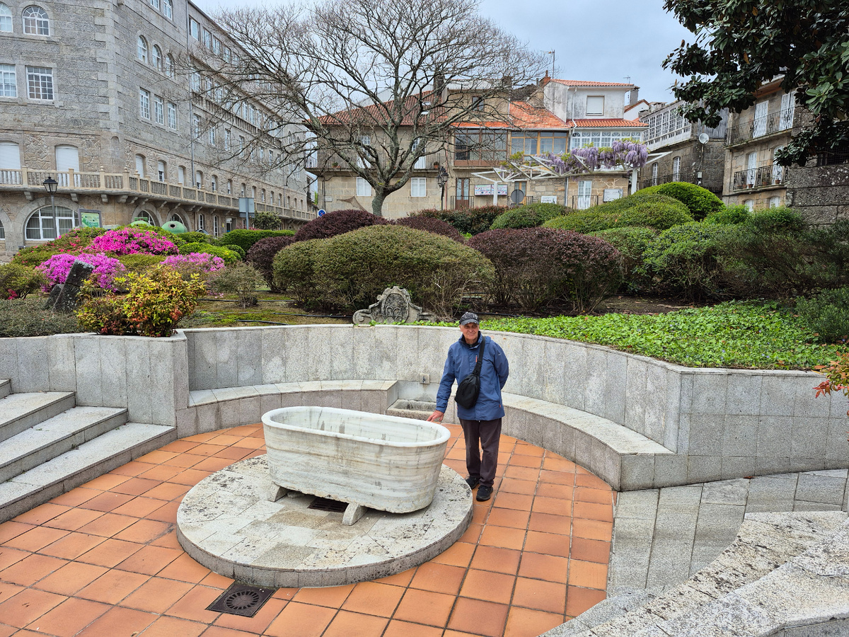 Предисловие: мы идем пешком Камино Португез из Лиссабона в Сантьяго. Это паломнический маршрут к собору в Сантьяго-де-Компостела, где находятся мощи Святого апостола Иакова. В конце пути (осталась 40 километров) случились проблемы с бронированием. Мы не смогли ничего приемлемого по цене найти в Падроне (городок недалеко от Сантьяго) и пришлось бронировать две ночи в деревне Кунтис (Cuntis), в стороне от маршрута. Что за деревня Cuntis - мы не знали. И вот что получилось! Да, вот так получилось. Не ждали, не гадали - оказались на водах. Деревня, в которую мы приехали, это бальнеологический курорт. А я то думала: что за странный знак нарисован рядом с названием Cuntis? Какой-то фужер с пузырьками. А это оказался знак минеральной воды. Но по порядку: утром лил такой дождь! Народ сидел в альберге до последнего: до 8 часов утра. Уже пришли девушки убираться, тогда все двинулись на выход. И мы тоже. Но ушли мы недалеко: в соседнем доме прачечная, которая работает с 8 часов утра. Вот т