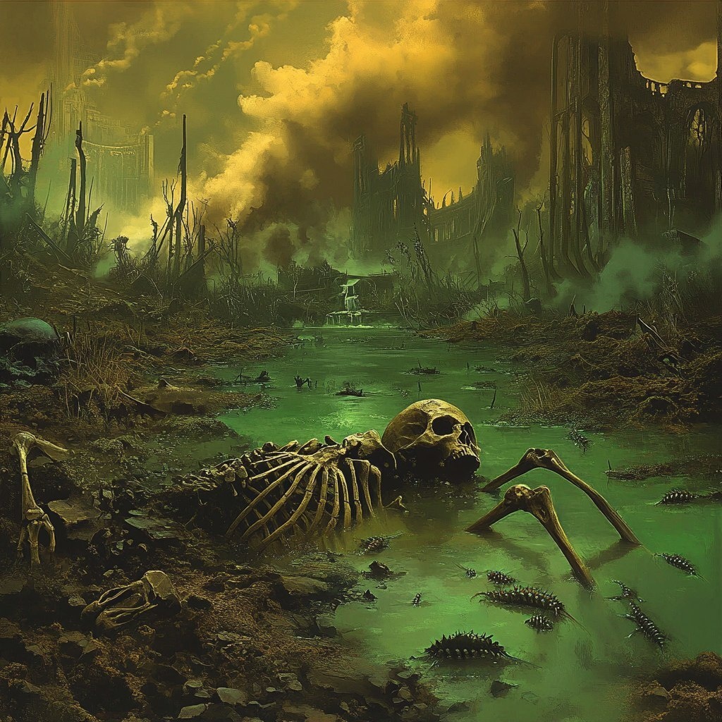 Создано на основе запроса: extremely detailed and realistic, rotten old skeleton lying in the wastelands, sea of mud, multiple black creepy mushrooms, ruins of a huge city in the background, numerous centipedes and larvae, toxic lakes, toxic creepy trees, shining green lakes, dense brown and green smoke, dense yellow fog --- Автоперевод: Чрезвычайно подробный и реалистичный, гнилой старый скелет, лежащий в пустоши, море грязи, множественные черные жуткие грибы, руины огромного города на заднем плане, многочисленные многочисленные многоноги и личинки, токсичные озера, токсичные жуткие деревья, сияющие зеленые озера, плотные коричневые и зеленый дым, плотный желтый туман Как тебе эта картинка? 🤔 https://dzen.ru/id/65c0c65c86e4f837c27b24d7 #ИИ #AI #нейросеть #midjourney #art