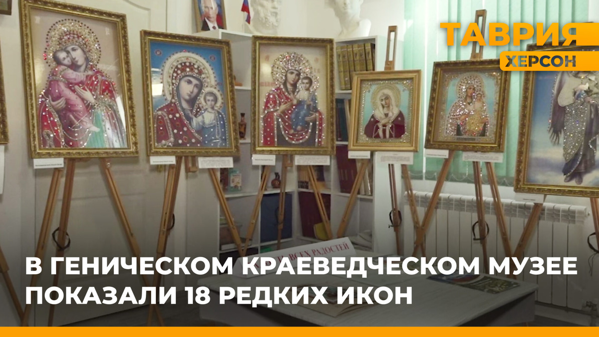 Экспозицию «Радость всех радостей» представили в Геническом краеведческом музее. 18 икон, украшенных стразами, жемчужинами и бархатом привезла жительница Красноярска. С выставкой по воссоединённым регионам она ездит уже три года. Центральная в экспозиции – Семистрельная икона Божьей Матери. Семь мечей здесь означают неизмеримость скорби и печали, которые перенесла Пресвятая Дева в земной жизни, прежде всего видя смерть Сына на кресте. Перед этим ликом молятся о смягчении характера, избавлении от злобы. Всего Любовь Казанцева привезла 18 икон. В окладах для оформления использовала стразы, жемчужины и бархат. Каждую работу делала обязательно под церковную музыку и колокольный звон. «Вы знаете, я порой садилась за работу и вот картинку сама построила, так и так, буду такие камешки использовать, а когда садилась, руки сами брали материал совершенно другой. И уже, когда готова работа я даже не предполагала, что она может быть такой», — отметила Любовь Казанцева. Любовь Казанцева 30 лет прор