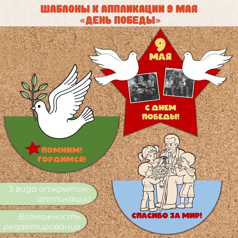 Шаблоны-заготовки к аппликации «9 мая», День Победы Материал содержит 3 вида открыток-аппликаций. Шаблоны открытки достаточно распечатать, вырезать. Далее самостоятельно раскрасить шаблоны с помощью красок, цветных карандашей или фломастеров. Подставку-круг сложить пополам в месте сгиба. Приклеить одну из картинок по центру подставки. Чтобы сделать поделку-звезду, необходимо распечатать все элементы. Военные фотографии можно вырезать фигурными ножницами. Приклеить все элементы на звезду, как показано на примере. Голубей приклеиваем по бокам с двух сторон (то есть нужно распечатать 4-х голубей). Подогнуть крылья сверху, чтобы добавить объема. Файл в формате PDF и PPTX. Есть возможность редактирования. Каждая деталь в формате png. Можно менять размеры всех деталей. Шаблоны-заготовки к аппликации «9 мая» можно скачать тут.