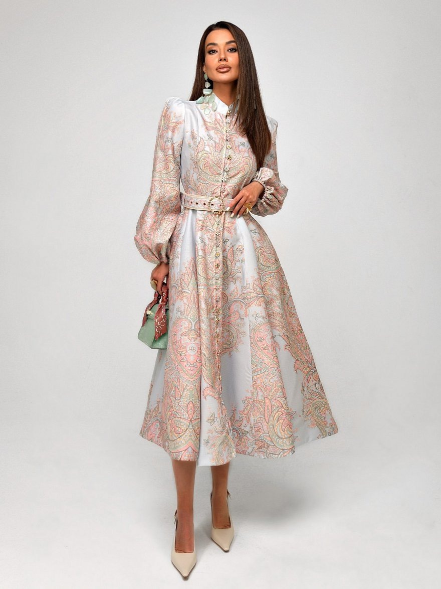 Это платье словно создано для лета: светлая палитра, благородный сатиновый блеск и деликатный пейсли-рисунок. Благодаря крою рубашки и широкому поясу силуэт получается выразительным и собранным. Рукава-фонарики добавляют романтики.