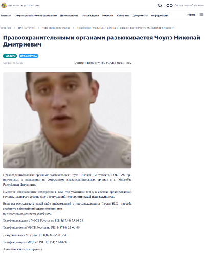 Правоохранительными органами разыскивается Чоулз Николай Дмитриевич, 03.02.1990 г.р., причастный к нападению на сотрудников правоохранительных органов в г. Малгобек Республики Ингушетия. Имеются обоснованные подозрения в том, что указанное лицо, в составе организованной группы, планирует совершение преступлений террористической направленности. Если вы располагаете какой-либо информацией о местонахождении Чоулза Н.Д., просьба сообщить в ближайший отдел полиции или