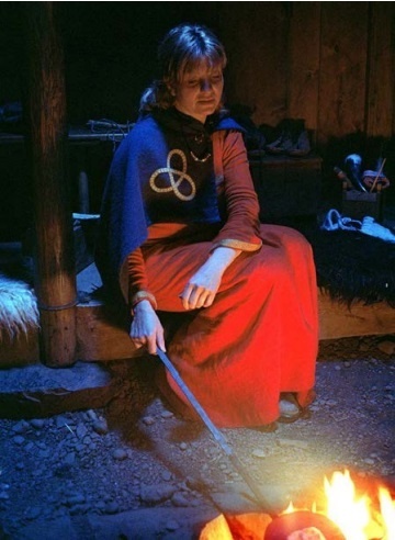 Хлеб обычно готовили из пресной ячменной муки, смолотой в каменных жерновах. Ручка жернова использовалась для вращения верхнего камня над нижним, перемалывая зерно между камнями. В Исландии использовались лавовые жернова, которые производили более мелкую муку. Каменная крошка из жерновов была найдена в восстановленной муке, поэтому хлеб, должно быть, был предназначен для зернистой трапезы. Тесто для хлеба было сделано из муки из пшеницы, ячменя, овса и ржи, размолотой на каменных жерновах, смешанной с сывороткой, медом и орехами. Затем тесто раскатывалось и готовилось на плоской сковороде над углями открытого огня (слева). Хлеб ели теплым, так как такие буханки становились твердыми, как камень, когда охлаждались. Кажется вероятным, что женщины готовили и подавали еду дома. В сагах есть один пример мужчины, готовившего еду дома, которого за это высмеивали ( Сага о Ватнсдэле, глава 44), хотя саги предполагают, что вне дома мужчины готовили себе еду сами (например, на собраниях, на борту