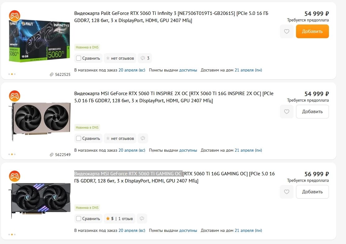 В российской сети электроники и комплектующих DNS появились первые модели видеокарты RTX 5060 Ti c 16 ГБ VRAM. Как и ожидалось, ценники очень далеки до “рекомендуемых”. Пока представлено всего три модели: Напомним, что рекомендуемая цена без учета НДС составляет по курсу примерно 35 000 рублей. Что касается RTX 5060 Ti c 8 ГБ на борту, то, как заявили профильные западные порталы, компания NVIDIA запретила партнерам выдавать их на обзоры кому бы то ни было, а сама партия этих видеокарт задержится на складах на две недели после 20 апреля.