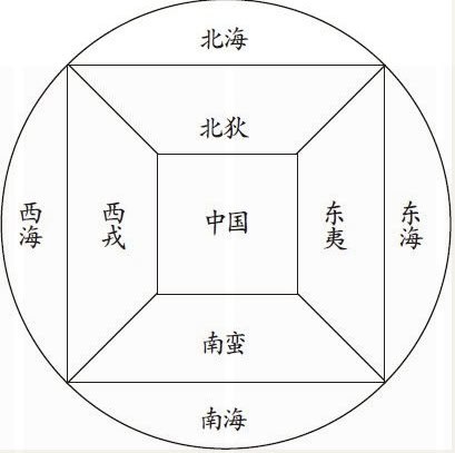 Представление китайцев о мире было следующим. Полусферическое небо расположено на квадратной земле, которая называется «мир» (天下). Верхняя, нижняя, левая и правая части квадрата символизируют четыре моря — по одному на востоке, западе, юге и севере, которые назывались «Четыре моря» (四海). Территория, где проживают люди, расположена посреди четырех морей и называлась «внутри четырех морей» (四海之内). Центр мира назывался срединным государством (中国), то есть страна в мире или четырех морях. Те, кто живет в Китае — Чжуся (诸夏) или Хуася (华夏). «Некитайские этнические группы» назывались И (夷) на востоке, Мань (蛮) на юге, Жун (戎) на западе и Ди (狄) на севере. И поэтому, когда стали появляться первые контакты с европейцами, то их стали называть варварами (蛮夷), так как те прибыли с юга и востока. #Культура