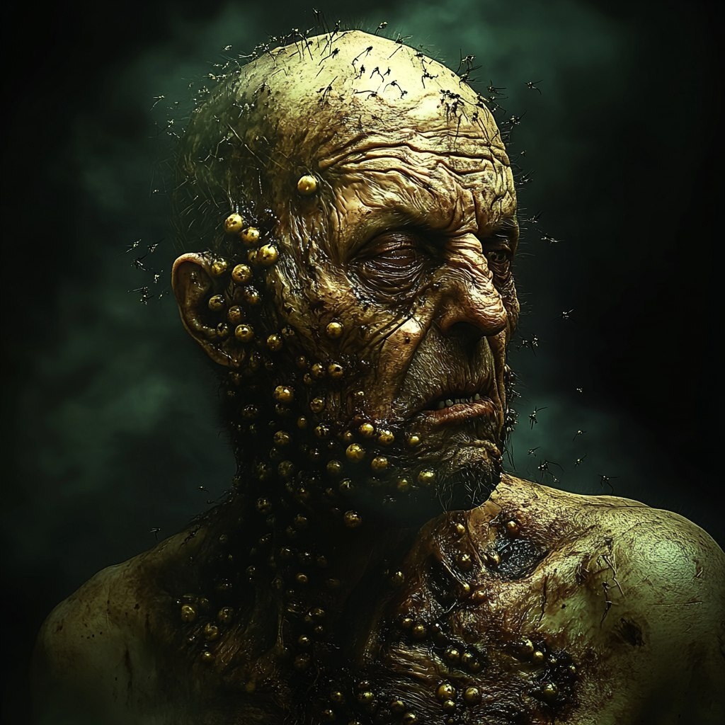 Создано на основе запроса: extremely detailed and realistic, total black background, portrait of ill creepy man, dense green and brown fog, swarm of flies, endless blisters and boils, rotten skin, sad face, extremely skinny body --- Автоперевод: Чрезвычайно подробный и реалистичный, общий черный фон, портрет больного жуткого человека, плотный зеленый и коричневый туман, рой мух, бесконечные волдыри и кипения, гнилая кожа, грустное лицо, чрезвычайно узкое тело Неплохо вышло? 🤔 https://dzen.ru/id/65c0c65c86e4f837c27b24d7 #ИИ #AI #нейросеть #midjourney #art