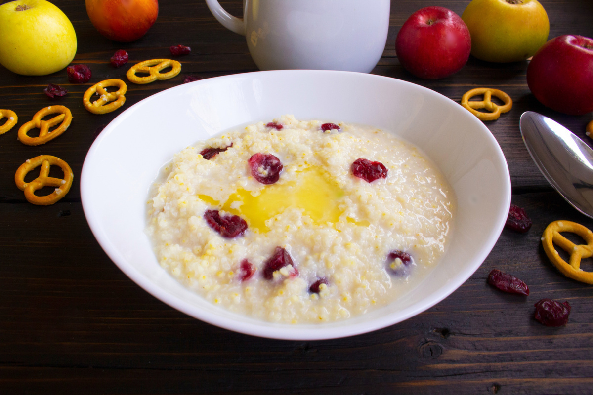 Кто любит молочные каши, тот часто ищет новые рецепты. Я уже смешивала рис и манку, пшеничную крупу и манку, добавляла в каши тыкву, изюм, орехи, яблоки, сухофрукты и так далее, и так далее. Предлагаю приготовить сладкую пшенную кашу с добавлением вяленых ягод. Я использовала для приготовления вяленую клюкву, но наверняка можно добавить в кашу и другие любимые ягоды. Каша получается вкусная, сытная и нежная. Рецепт простой, но может кому-то он добавит разнообразия и ягоды еще больше улучшат любимое блюдо. Вода - 200 мл. Пшено - 100 г. Молоко - 200 мл. Клюква вяленая - 30 г. Сахар коричневый - 2 ч.л. Соль - 2 щепотки Масло сливочное - для подачи Пшено промоем, выложим его в удобную посуду и зальем водой. Поставим посуду на огонь и варим пшено 20 минут. Добавим в кашу сахар и соль по вкусу. Добавляем в кашу вяленые ягоды. Вливаем молоко в кастрюльку. Перемешиваем кашу и готовим ее еще 10 минут. Подаем горячую кашу с кусочком сливочного масла. Либо можно добавить сливочное масло в кастрюл