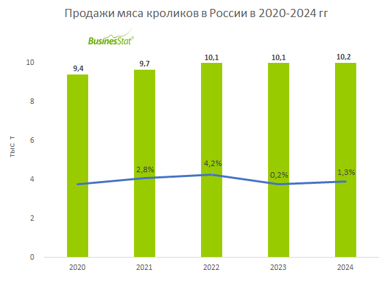 По данным «Анализа рынка мяса кроликов в России», подготовленного BusinesStat в 2025 г, в 2020-2024 гг его продажи в стране выросли на 8,7%: с 9,4 до 10,2 тыс т. Продажи росли ежегодно, наибольший темп прироста наблюдался в 2022 г (4,2%). Существует ряд предпосылок, определяющих рост продаж мяса кроликов в России в долгосрочной перспективе. Во-первых, это низкий базовый уровень потребления продукта. В 2020 г на душу населения с России потреблялось менее 130 г мяса кроликов, включая как все сектора продаж, так и натуральное потребление. Для сравнения, в европейских странах этот показатель доходит до 2 кг в год. Таким образом, российский рынок имеет значительные резервы роста.Во-вторых, наблюдается тенденция сокращения поголовья кроликов в личных хозяйствах населения и роста его в сельскохозяйственных организациях. Таким образом, потребление мяса кроликов плавно перетекает из натурального сектора в коммерческий, что создает предпосылки для роста продаж.Еще одним фактором роста спроса явл