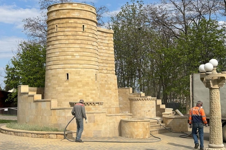 В парке «Дружба: Волгоград – Баку» в Центральном районе специалисты приступили к очистке архитектурного объекта «Девичья башня». Как сообщили V102.RU в пресс-службе парка, рабочим при помощи пескоструйного аппарата в общей сложности предстоит привести в порядок 1 800 квадратных метров каменной поверхности. В настоящее время выполнено 70% от общего объема работ. Уже приведены в порядок каменные основания лавочек, в том числе скамьи в форме полукруга, а также парапеты, кашпо и фигурные ограждения клумб. В скором времени также будут очищены элементы входной группы в парк и архитектурный объект «Девичья башня». Благодаря пескоструйной очистке удается бережно удалять все загрязнения даже в труднодоступных участках. После этого поверхность обработают гидрофобизатором, который защитит объект от воздействия атмосферных осадков, предотвратив попадание влаги в пористую поверхность камня. Также специалистам необходимо вернуть достойный вид входной группы: обновить элементы наименования парка, очи