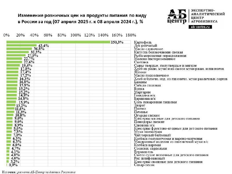 📈 Цены на картофель в России за год взлетели почти на 300% Средние оптовые цены на картофель за последний год взлетели на 285,5% – с 11 до 42 рублей за килограмм, посчитали в экспертно-аналитическом центре агробизнеса «АБ-Центр». В рознице его стоимость также увеличивается, корнеплод лидирует по темпам роста цен среди другой плодоовощной продукции. Из данных Росстата следует, что за год средняя цена картошки в рознице выросла с 30 до 76 рубля. То есть за последние 12 месяцев, согласно официальной статистике, она подорожала на 150%. "Если в опте цены увеличились на 31,4 руб., то в рознице – на 42,3 рубля. Но поскольку изначально уровень цен в опте и рознице разный, то в первом случае картофель подорожал в 3,9 раза, а во втором – в 2,4", – комментирует ситуацию гендиректор «АБ-Центра» Алексей Плугов. Почти все овощи из так называемого борщевого набора также заметно подорожали. Стоимость лука выросла с 16 до 28,5 рубля, свеклы – с 19,7 до 26,2 рубля, капусты – с 19,8 до 30,4 рубля.