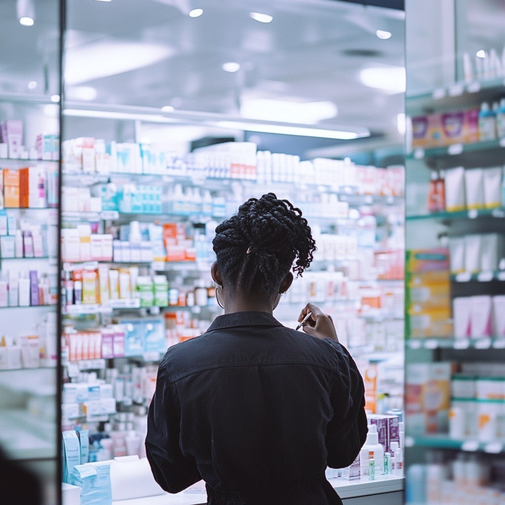 Создано на основе запроса: Young black woman writing on a large mirror in a pharmacy store, the womans back is facing the camera, the