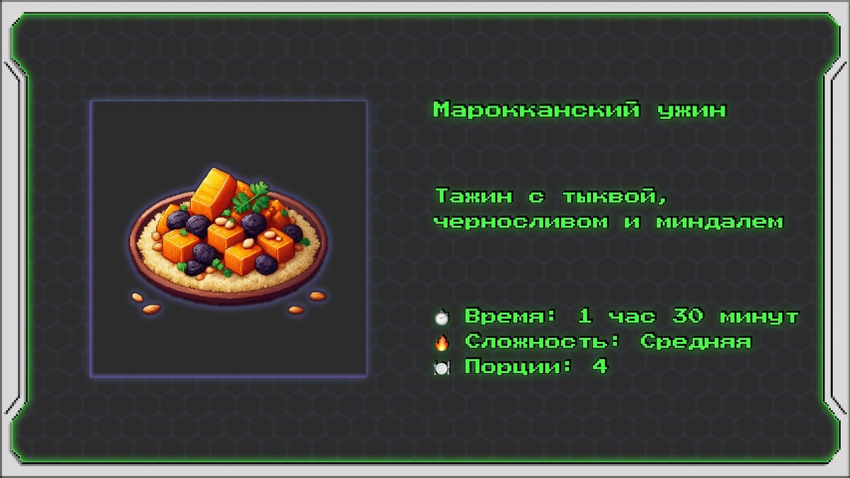 Марокканский ужин Тажин с тыквой, черносливом и миндалем Этот рецепт представляет собой классический марокканский тажин — блюдо, приготовленное в глиняной посуде с крышкой в форме конуса. В этом варианте сладкая тыква сочетается с черносливом и обжаренным миндалём, создавая гармонию сладких и пряных вкусов. Это традиционное блюдо идеально подходит для сытного ужина и отражает богатство марокканской кухни. Информация о рецепте: ⏱️ Время: 1 час 30 минут 🔥 Сложность: Средняя 🍽 Порции: 4 Ингредиенты: Для тажина: • 🍂 Тыква (нарезанная крупными кубиками) — 500 г • 🌰 Чернослив (без косточек) — 100 г • 🌰 Миндаль (очищенный и слегка обжаренный) — 50 г • 🧄 Чеснок (измельчённый) — 2 зубчика • 🌿 Имбирь (натёртый) — 1 чайная ложка • 🌶 Куркума молотая — ½ чайной ложки • 🌿 Корица молотая — ½ чайной ложки • 🌶 Паприка молотая — 1 чайная ложка • 🫒 Оливковое масло — 2 столовые ложки • 🍯 Мёд — 1 столовая ложка • 💧 Вода — 300 мл • 🧂 Соль — по вкусу • 🌶 Молотый чёрный перец — по вкусу