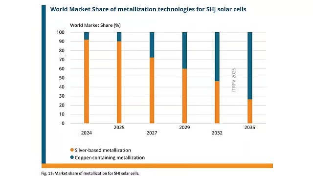 8,5 тысяч тонн серебра в год! 8 616,7 тонн серебра (по подсчётам Немецкого союза машиностроителей, выпускающего уже 16 лет Международную технологическую дорожную карту фотовольтаики (ITRPV)) было израсходовано в 2024 году на солнечные модули мировыми производителями. Это около 27,6% от объёма мировых поставок. То есть, четверть всего серебра идёт на солнечную промышленность! Теперь понятно, почему все так резко взялись за то, чтоб заменять серебро на медь? Деньги! Вот ответ (не хочу говорить, что я говорил, но я же говорил...). На каждый кремниевый элемент тратится от 70 до 140 мг серебра в зависимости от того, какого типа этот элемент. Меньше всего – 70 мг/элемент – в элементах PERC. Около 110 мг/элемент – у TOPCon и IBC. А самыми прожорливыми оказались гетеропереходные элементы, потребляющие 140 мг серебра элемент. Ну, и, конечно же, прогнозы. Без этого – никак. На то это и «дорожная карта». В общем, меди прогнозируют постепенное увеличение доли в металлизации контактов солнечных