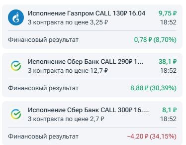 Всем привет! Продолжаем #угадайопцион 🚨Прошла экспирация опционов: Sber Call300 , Sber Call290 Gazp Call130 Результаты на скрине. Идея угадайки: 👉Берем три актива, Юань, Сбер, Газпром 📍Юань - месячный опцион - т.е. сейчас с исполнением 15.05 📍Сбер и Газпром - недельные опционы, с исполнением 23 апреля. 🔊В комментах пишем вариант цены закрытия актива к указанной дате и какой это опцион - Put (цена упадет до определенного значения) или Сall (цена вырастет до определенного значения). А я куплю указанные опционы - Юань - 1 шт, Сбер - 3 шт, Газпром - 3 шт. Т.е. сегодня можно писать вариант покупки на акции с исполнением на 23 апреля, а на юань 15 мая. ✅Варианты опционов по Сберу На рост: 300 | 310 | 320 | 330 | 340 | На падение: 290 | 280 | 270 | 260 | 250 | 240 ✅Варианты опционов по Газпрому На рост: 135 | 140 | 145 | 150 | 155 | На падение: 130 | 125 | 120 | 115 | 110 | 105 ✅Варианты опционов по Юаню На рост: 11.2| 11.4| 11.6 | 11.8 | 12.0 | 12.2 | На падение: 11.0 | 10.8