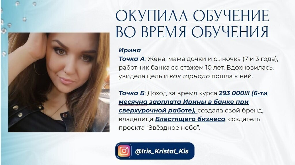 293 000 рублей уже во время обучения Моя ученица смогла окупить курс еще во время обучения и заработать Хочешь зарабатывать на стразах? Галактика из кристаллов на потолке автомобиля за 130 000₽! 🔥🔥🔥Работа моей ученицы Ирины Ульяновой Заказчик попросил сделать на крыше автомобиля россыпь из кристаллов , но Ирина предложила такой вариант, от которого владелец авто, а к слову это мужчина, не смог отказаться🔥🔥🔥! Сумма заказа составила 130 000 рублей! Ирина специально приехала в Москву выполнить блестящий заказ! Это непростое заказ, все полностью: от создания эскизы до сложный инкрустации на потолке Ирина выполняла сама! Заказчик доволен и я счастлива, что мои девочки зарабатывают прямо во время обучения и берут такие крутые дизайнерские проекты! За период обучения Ирина заработала 293 000 рублей! Хотите знать, как она это сделала? Заходите на онлайн-встречу Инкрустация стразами или бизнес по-женски Заходите быстрее! ПЕРЕХОДИТЕ СЕЙЧАС🔽🔽🔽 ПЕРЕХОДИТЕ СЕЙЧАС🔽🔽🔽 https:/