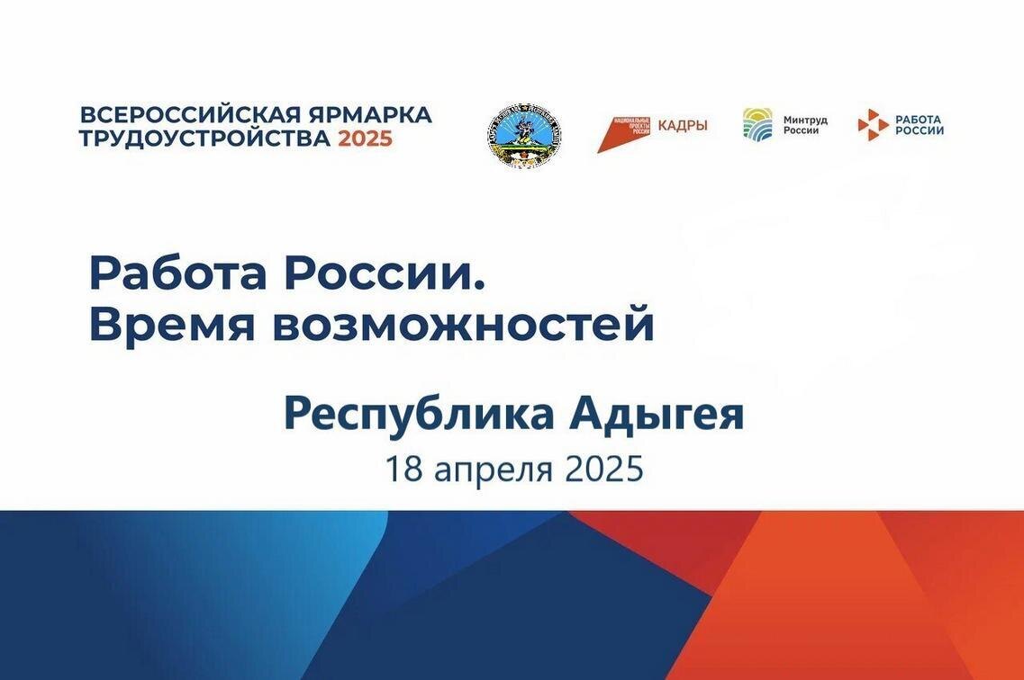 18 апреля в Адыгее состоится региональный этап Всероссийской ярмарки трудоустройства «Работа России. Время возможностей». Присоединяйтесь к ярмарке на одной из трех площадок: ✅Филармония КОРА, г. Майкоп, ул. Пионерская, д. 300; ✅Центр занятости населения, а. Тахтамукай, ул. Хакурате, д. 65; ✅Центр занятости населения, пос. Тульский, ул. Первомайская, д. 181. Время проведения ярмарки: с 10:00 до 14:00. На ярмарке вас ждут: ➡️встречи с ведущими работодателями; ➡️профориентация; ➡️мастер-классы и консультации для уверенного старта или карьерного роста. Узнать подробности о мероприятии можно на сайте