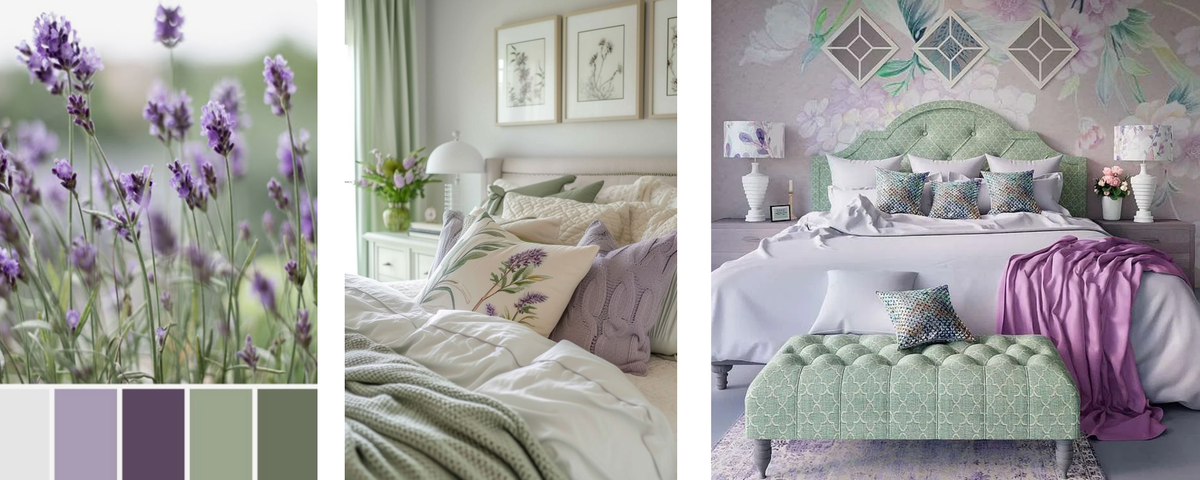 Не показную, а настоящую. Спокойную и простую. Когда я проектирую спальню, в первую очередь думаю не о цвете стен или выборе покрывала. Я думаю о состоянии. О том, что человек почувствует, когда закроет дверь и останется один в этом пространстве. И цвет здесь играет не меньшую роль, чем планировка. Лавандовый — один из самых деликатных цветов в палитре. Он не перегружает. Он не требует внимания. Он просто есть — мягкий, пыльный, немного прохладный. В интерьере он работает как фон, как поддержка. В нём легко дышать. Он не давит и не утомляет, в отличие от ярких оттенков фиолетового. Лавандовые стены создают ощущение воздуха и порядка. Бархатное изголовье кровати в глубоком аметистовом оттенке добавляет акцент и глубину. Мягкий текстиль — плед, подушки, шторы — продолжают эту палитру, делая её объёмной. Всё вместе — это интерьер, в который не хочется добавлять лишнего. Освещение важно.