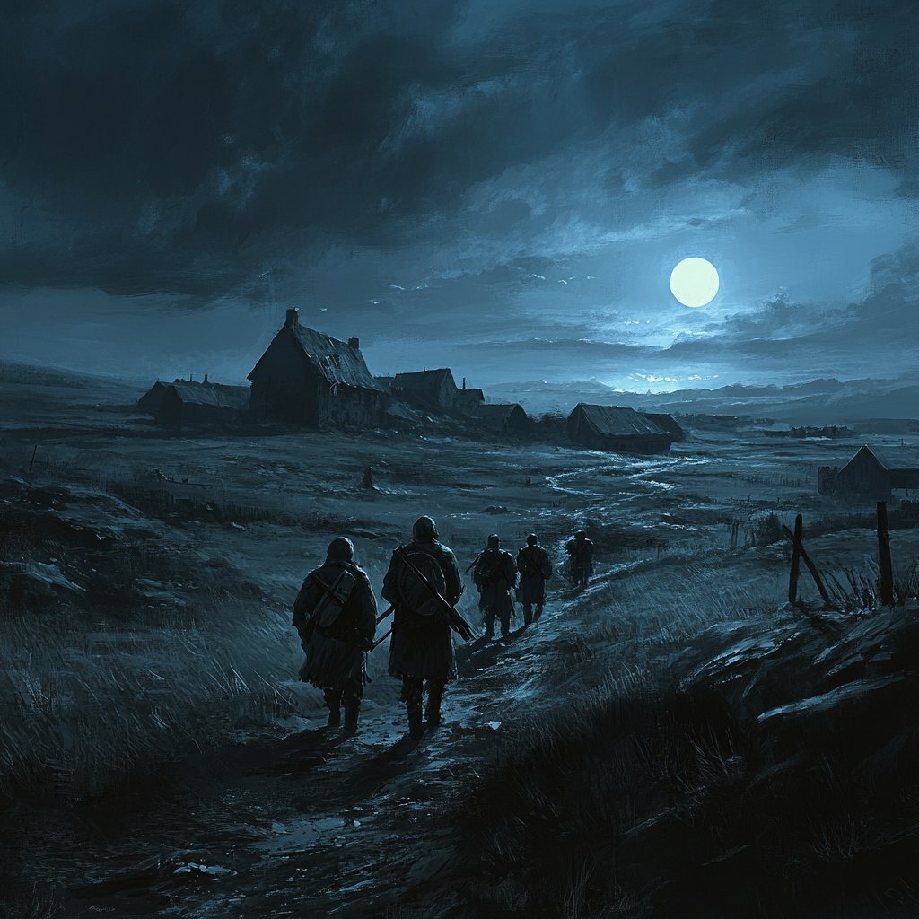 Создано на основе запроса: a small group of medieval soldiers advance through a plain countryside, abandoned houses on the horizon. all dark, moonlight, artwork --- Автоперевод: Небольшая группа средневековых солдат продвигается по простой сельской местности, заброшенных домах на горизонте. Как тебе эта иллюстрация? 🤔 https://dzen.ru/id/65c0c65c86e4f837c27b24d7 #ИИ #AI #нейросеть #midjourney #art