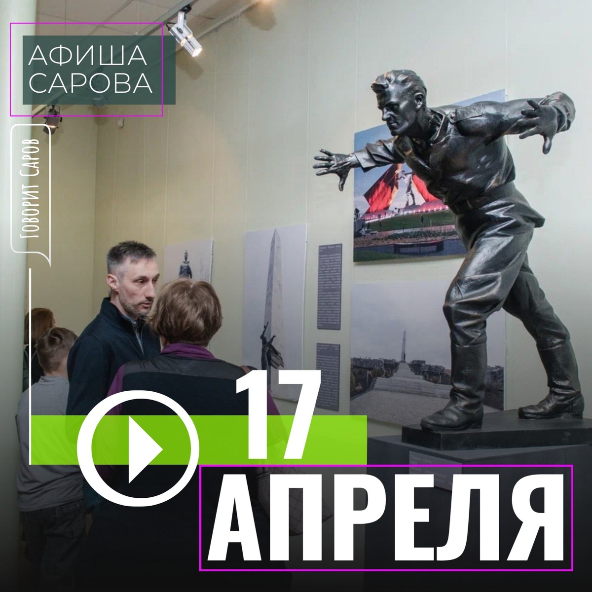 ↗ ЧТО ГДЕ ПРОИСХОДИТ В САРОВЕ 17 АПРЕЛЯ 🏃Проект «Спорт в каждый двор» 10:00-13:00 Спортивная площадка ул.Казамазова,10 13:00-16:00 Спортивная площадка ул.Силкина,20 16:00-19:00 Спортивная площадка в сквере Мкр. 22 (ул.П.Морозова) 🥅Ледовый дворец (ул. Московская, 5, Саров, тел. 9-49-14) 10:00-11:00 Льготное катание на коньках 🏸Молодежный центр (ул. Куйбышева 19/1, тел. 9-91-05) 13:00 Акселератор проектов. Муниципалитеты 🎯Тир МБОУ "Школа №14" (ул. Юности, 11, тел. 9-51-40) 15:00 Соревнования города Сарова «Кубок Победы по пулевой стрельбе, посвященные 80-летию Победы в Великой Отечественной Войне» 🏛Городской музей (пр. Мира, 48, тел. 3-42-56) «Поехали!» выставка фотографий из фондов Городского музея ко дню космонавтики Курс познавательных занятий (по предварительной записи) (6+): «Лес полон сказок и чудес», «Пернатые соседи», «Жужжащие истории», «Красивые и редкие», «История рядом» 🖌Художественная галерея (пр. Мира, 1, тел.…