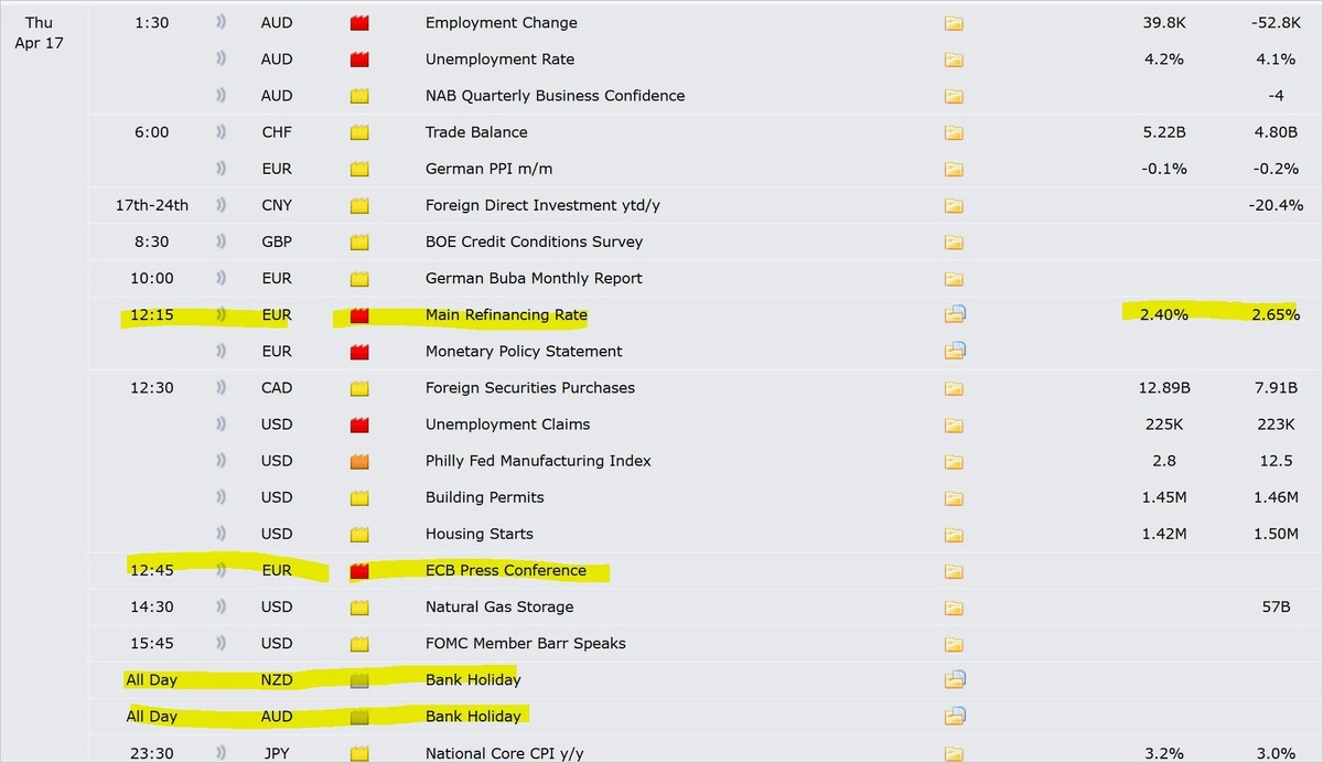 Доброго вечера, уважаемые подписчики канала и коллеги трейдеры. Представляю Вашему вниманию экономический календарь на четверг, 17 апреля. ❗️Обратите внимание❗️ 👉🏻На пред маркет американской сессии - ЕЦБ опубликует решение по ставкам и проведет пресс конференцию. 👉🏻 Время выхода новостей указано по UTC 🔍 Актуальные ссылки на вебинары авторского курса 🧐 Регистрация ЛК в новостном аналитическом портале 🖥️Записи обзоров и вебинаров доступны на площадках: 🟣ТГ (чат) 🟣Дзен 🟣RuTube 🟣ВК 🟣YouTube #календарь