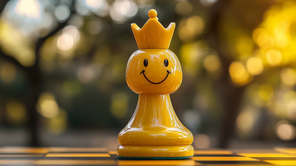 Создано на основе запроса: a cute cartoon yellow king chess piece with a kind smiling face, wearing a small crown, glossy yellow toy-like