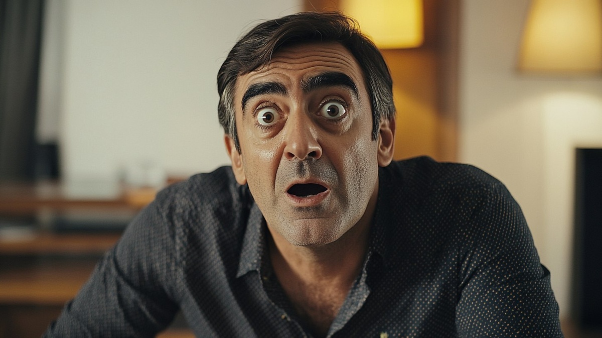 Создано на основе запроса: We see Juan, an Argentinian man in his 40s, sitting in front of a wooden table, with a surprised and comical