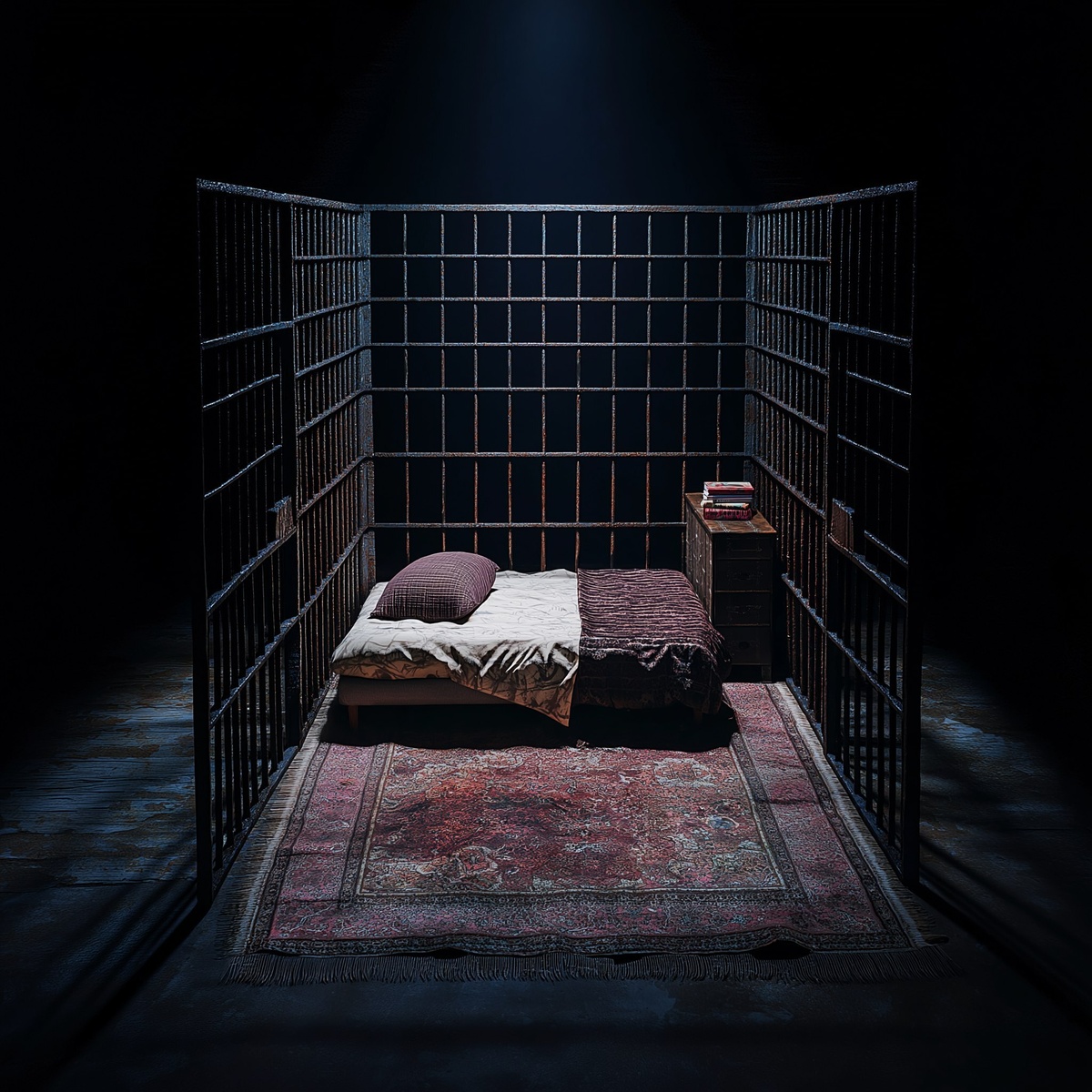 Создано на основе запроса: a cell made of bars on all sides. It sits in the middle of a dark room. We are looking down from onto the cell from an angle above, there is a spotlight on the cell. We cannot see anything outside of the cell as darkness surrounds it. Inside the cell is not austere, but luxurious. There is an area rug, small bed with nice blanket, bookcase, etc. photo realistic. --- Автоперевод: ячейка из стержней со всех сторон. Как тебе генерация? 🤔 https://dzen.ru/id/65c0c65c86e4f837c27b24d7 #ИИ #AI #нейросеть #midjourney #art
