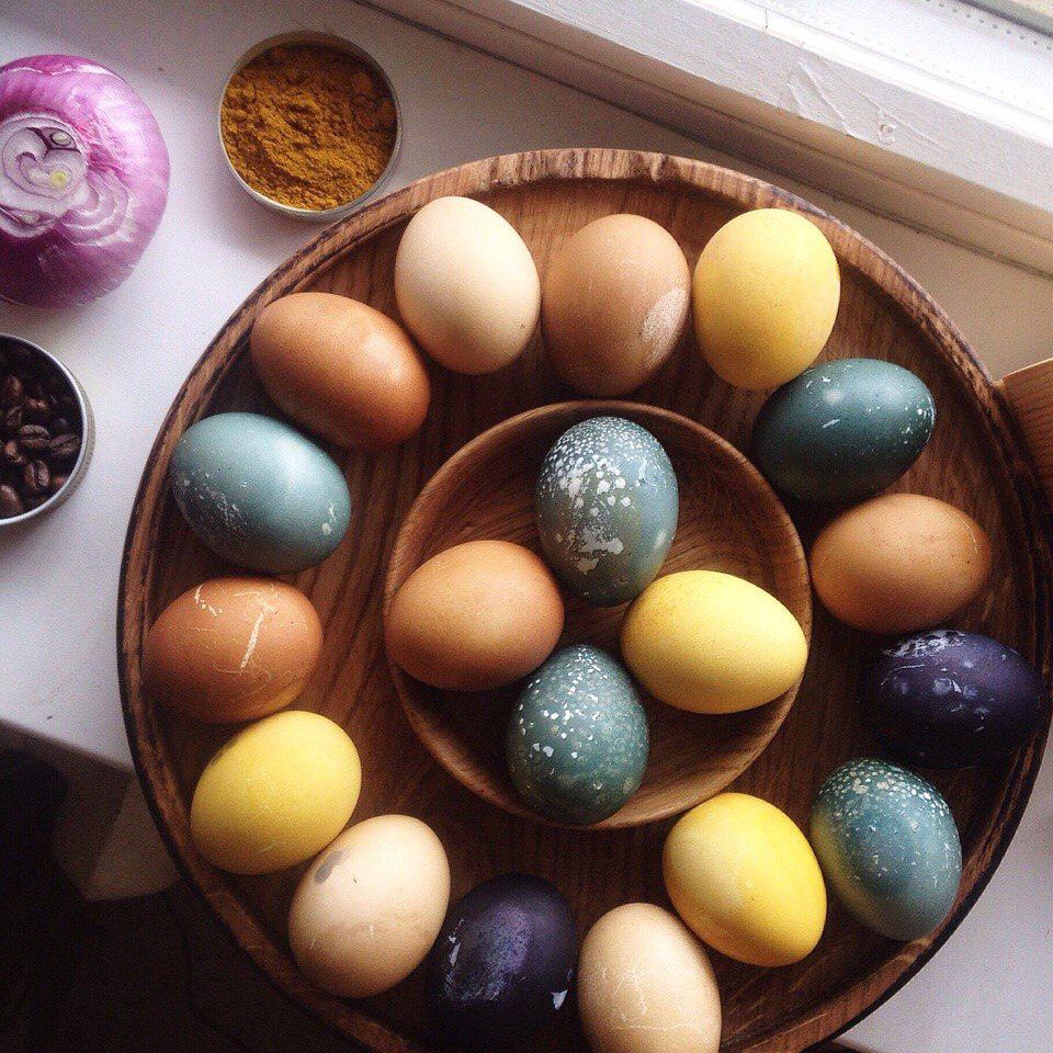 2. Желтый. Я использовала куркуму. Принцип тот же - залила ее кипятком и оставила в этой жидкости яички на ночь. 3. Сине-голубой. Самыми космическими яйца получаются от краснокачанной капусты. Капусту измельчаем и доводим до кипения, сцеживаем получившийся отвар (я закинула прямо так и остались следы необычные) и оставляем на ночь. 4. Коричневый. Яйца были отправлены в чашку с недопитым кофе. Интенсивность слабенькая, думаю что если поварить перед этим побольше кофе в кастрюльке, то цвет будет насыщенней. Наверняка от чая похожий эффект. Кофе я как то предпочитаю во внутрь 😂