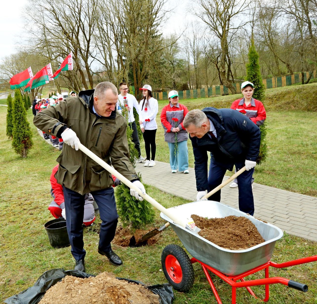 #годблагоустройства ⚡️⚡️На субботник с молодежью. ✅В рамках мероприятий Года благоустройства работающая молодежь ОАО "Александрийское", структурных подразделений, входящих в состав агропромышленного холдинга Управления делами Президента Республики Беларусь, провела субботник на территории памятника «Скорбящая мать» в агрогородке Александрия. ➡️В субботнике приняли участие управляющий делами Президента Республики Беларусь Юрий Назаров, председатель Могилевского облисполкома Анатолий Исаченко, председатель Шкловского райисполкома Сергей Бартош, генеральный директор РУП "Купаловское" - управляющая компания холдинга" Дмитрий Лушаков и директор ОАО "Александрийское" Дмитрий Малашенко. 📌Была очищена прилегающая к памятнику территория от мусора и опавших листьев, обновлено ограждение. ✅Молодежь и представители власти вместе высадили туи. ‼️В знак уважения к тем, кто погиб в годы Великой Отечественной войны, участники мероприятия возложили цветы к мемориалу и почтили их память минутой м