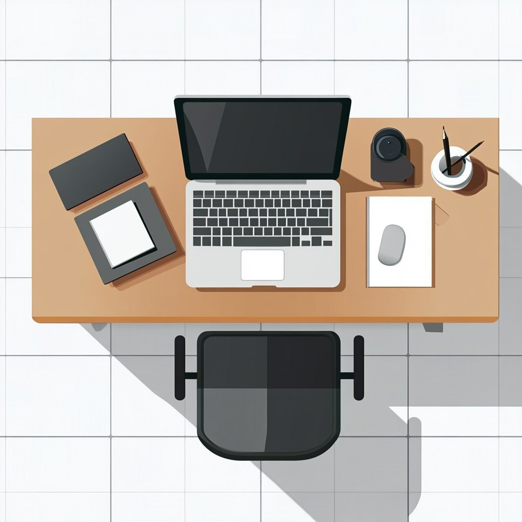 Создано на основе запроса: a top view of a vector table with a laptop and office utilities on it with fine tiles under the table