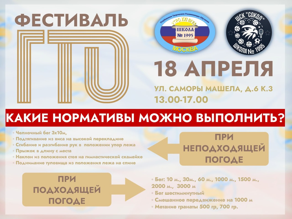Фестиваль ГТО уже скоро! 🗓 Когда? В пятницу, 18 апреля 2025 года 🕒 Во сколько? 13.00-17.00 📍 Где? В здании школы, по адресу: ул. Саморы Машела, д.6 к.3 Если погодные условия позволят, то на спортивном стадионе участники выполнят: * Бег 10 м * Бег 30 м * Бег 60 м * Бег шестиминутный * Смешанное передвижение на 1000 м * Бег 1000 м * Бег 1500 м * Бег 2000 м * Бег 3000 м * Метание гранаты 500 гр, 700 гр. Если погода не позволит, то в спортивных залах будет организована сдача нормативов: - Челночный бег 3х10м, - Подтягивание из виса на высокой перекладине - Сгибание и разгибание рук в положении упор лежа - Прыжок в длину с места - Наклон из положения стоя на гимнастической скамейке - Поднимание туловища из положения лежа на спине 🔗Также предлагаем посетить официальную группу Федерального оператора Всероссийского физкультурно-спортивного комплекса ГТО, где вы найдете ответы на популярные вопросы. #ДОНМ #ШколыКолледжиМосквы #школа1995 #СпортВШколе #ШСКСокол #ВсегдаСоСпортом