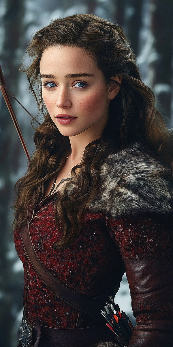 Создано на основе запроса: realistic image of an older woman with features like emilia clarke long wavy dark brown hair with blue eyes wearing leather and fur with a bow and arrow in a winter forest