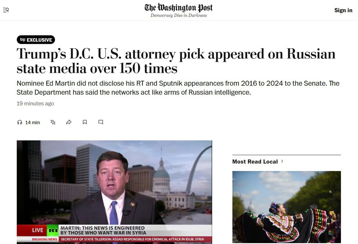 The Washington Post возмущается: Трамп назначил врио прокурора в округе Колумбия частого гостя RT и Sputnik. Эдвард Мартин был в эфирах более 150 раз, посчитало издание. Главное из материала: ▪️Мартин — консервативный активист и республиканец — появлялся в эфирах российских СМИ в качестве приглашённого комментатора с августа 2016 по апрель 2024 года; ▪️WP отмечает, что в этот период Мартин появлялся на RT и Sputnik чаще, чем в программах любой другой крупной сети кабельного вещания; ▪️до начала конфликта на Украине Мартин критиковал власти США за нагнетание военной истерии вокруг России и игнорирование её интересов безопасности; ▪️Мартин вставал на сторону RT и Sputnik, когда Госдеп называл их «критически важными элементами в пропагандистских усилиях Москвы»; ▪️Мартина обвинили в усилении «антиамериканской пропаганды» на российских телеканалах. Тот факт, что он появлялся на RT и Sputnik и не сообщал об этом, вызывает сомнения по поводу его суждений и честности, приводит WP выска