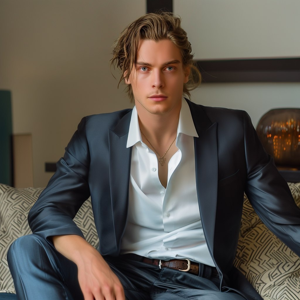 Создано на основе запроса: Very handsome white man, 22 years old, shiny navy suit