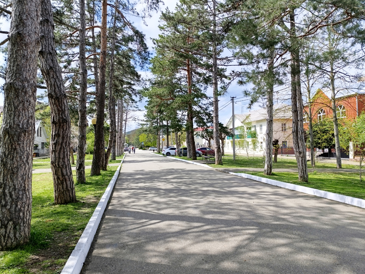 Одной из изюминок города - курорта является "Аллея 1000 сосен". И это не просто сосны, а пицундские и сосны Коха, которые начали высаживать в далеком 1952 году. Для этого привлекались и школьники. И хозяйка моего гостевого дома была одной из них. Официально это улица Ленина, но поэтическое название «Аллея Тысячи сосен» гораздо больше нравится отдыхающим. Это главная прогулочная улица Горячего Ключа, можно сказать, его туристическое сердце. Аллея частично пешеходная, в некоторых местах разрешено движение автомобилей, но они тут ездят очень редко и очень медленно. К тому же, для удобства пешеходов, вдоль нее проложены просторные тротуары в тени сосен и разбиты очень ухоженные газоны с благоухающими растениями. Не знаю название, по запаху похоже на черемуху Трудно сказать, точно ли сосен тысяча, но то, что аллея бесконечная это точно! Я так ни разу и не дошла до конца, да и на автобусе по ней довольно долго ехали. А какие здесь дома! Можно каждый фотографировать 👍 Множество ра