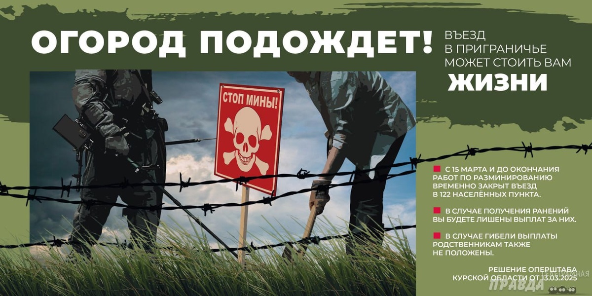 📌 Напоминаем, по решению оперативного штаба до окончания работ по разминированию территории, закрыт въезд на территорию 122 населенных пунктов приграничья, а также на сельскохозяйственные и лесные угодья, прилегающие к ним. #МыПобедим #СводкиКурскаяОбласть