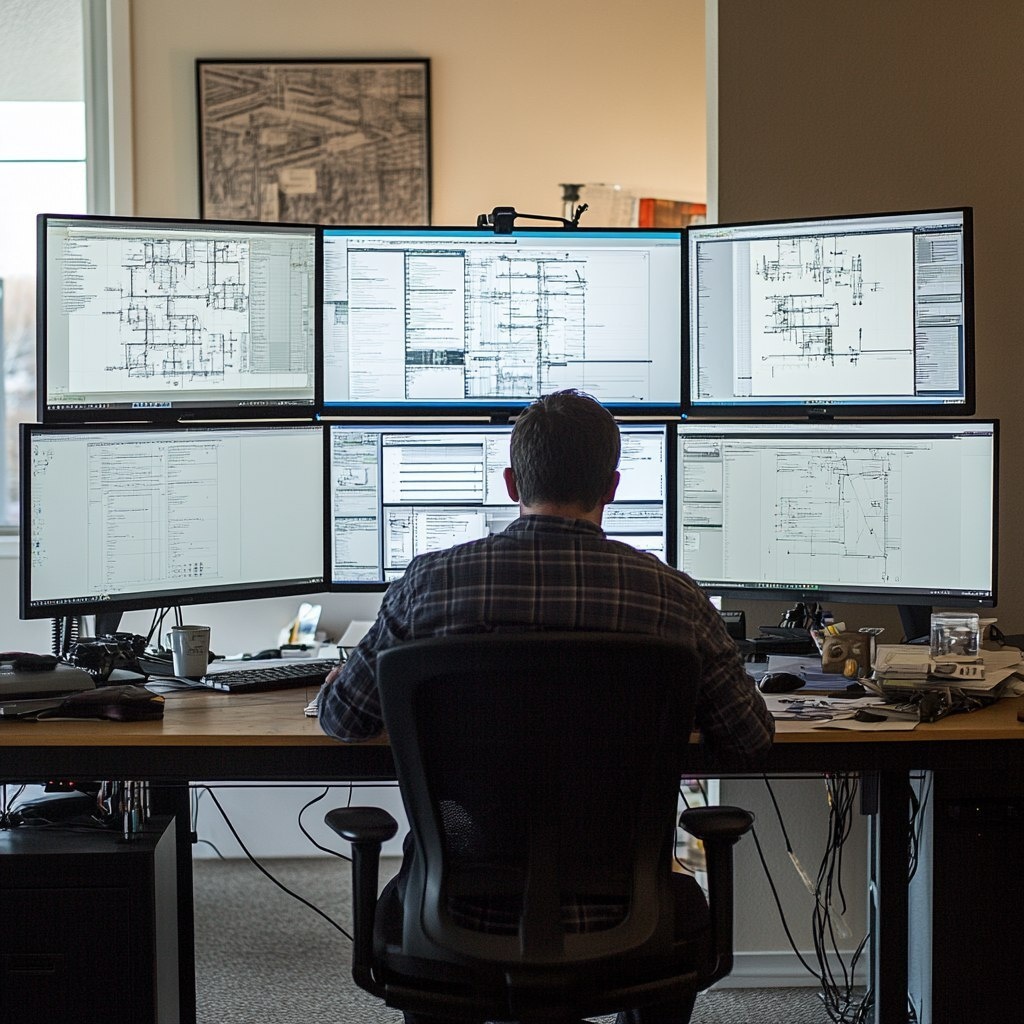 Создано на основе запроса: A system engineer deeply focused, designing complex system architecture on multiple monitors, modern office