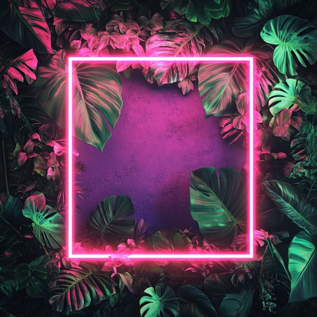 Создано на основе запроса: social media frame design, square layout (1:1) neon pink, neon green and lights