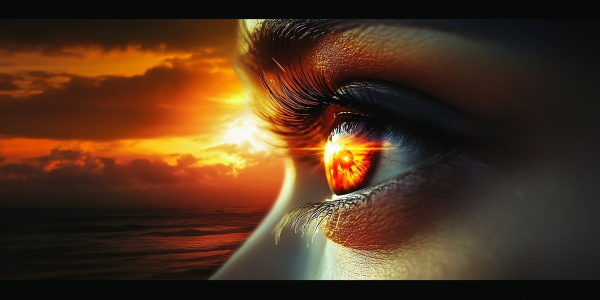 Создано на основе запроса: surreal pic of sadness in the shimmering of your eyes, reflected the reddening sun in the sunset