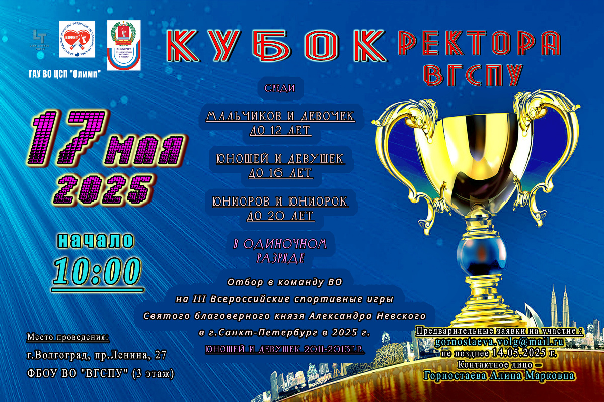 Доброго времени суток, уважаемые любители настольного тенниса!☀️ В субботу, 17 мая 2025 года, Волгоградская областная Федерация настольного тенниса (ВОФНТ) приглашает юных спортсменов Волгограда и Волгоградской области принять участие в официальных региональных соревнованиях «Кубок Ректора ВГСПУ» по настольному теннису среди детей! Место проведения: г.Волгоград, пр. им. В.И. Ленина, 27, ФБОУ ВО "ВГСПУ" (большой зал, 3 этаж). «Кубок Ректора ВГСПУ» среди детей проводится по следующим категориям: 🏓- мальчики и девочки до 12 лет; 🏓- юноши и девушки до 16 лет; 🏓- юниоры и юниорки до 20 лет. ❗09:00 – Разминка, прием заявок. ❗10:00 – Начало соревнований. Квалификационный и финальный этапы. Соревнования проводятся в одиночном разряде. ‼️Также на соревнованиях проводится отбор в команду Волгоградской области (2 юноши и 2 девушки) на III Всероссийские спортивные игры Святого благоверного князя Александра Невского в г. Санкт-Петербург в 2025 г. среди юношей и девушек 2011-2013 г.р..‼️