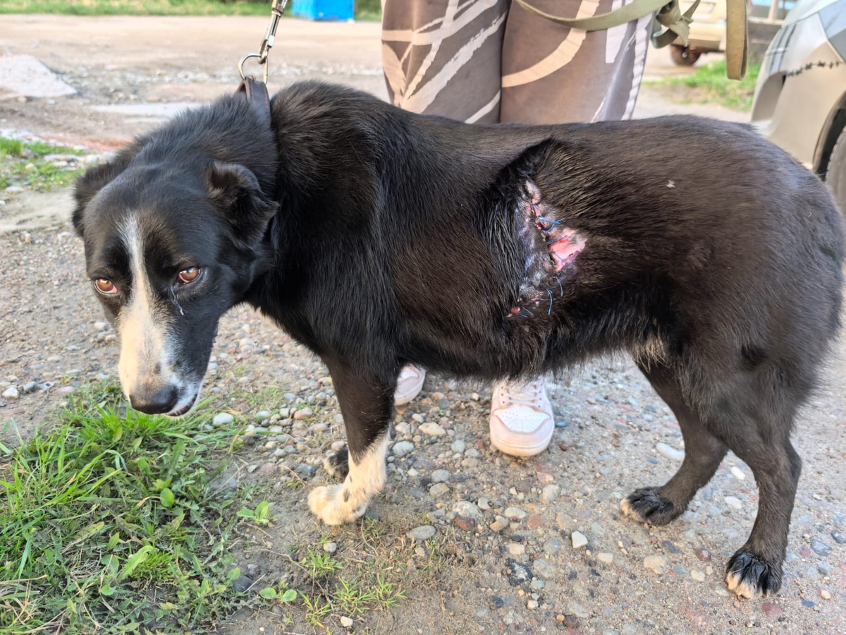 Девочка Лапка ОЧЕНЬ травмирована, рёбра сломаны настолько, что невооружённым глазом видна вмятина на них, в боку зияющая рана! Как нам рассказали, её пытался зашить какой-то местный «умелец»… Чем это грозило Лапочке и какую боль она перенесла, остаётся только догадываться!