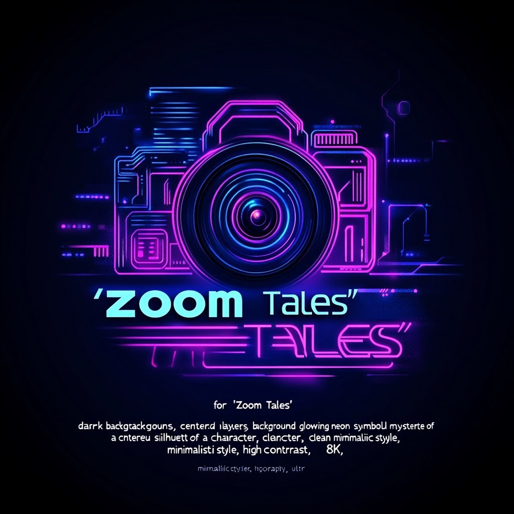 Создано на основе запроса: "cinematic logo design for 'Zoom Tales', dark background, glowing neon blue and purple colors